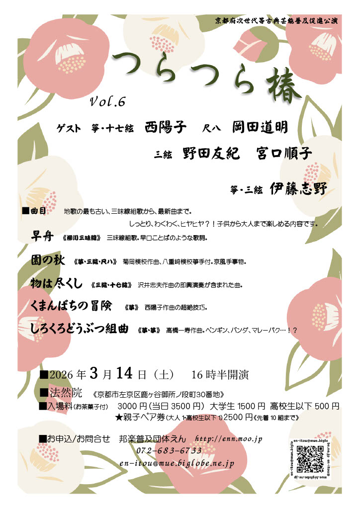 京都・大阪・和歌山を中心に活動する邦楽普及団体。全国学生邦楽フェスティバル、おち椿の会他多数コンサートを開催。伝統文化お箏三味線親子教室や、気軽にお稽古を始めるえん箏の音を楽しむ会も。